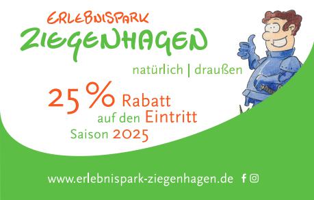 Unter Vorlage des Rabattcoupons erhalten Sie 25 % Rabatt auf Ihren Eintritt in der Saison 2025. Der Erlebnispark Ziegenhagen liegt im Geo-Naturpark Frau-Holle-Land, zwischen Kassel und Göttingen, nur 5 Minuten von der A7 entfernt und heißt alle kleinen und großen Besucher herzlich willkommen. Neben vielen Spiel- und Fahrattraktionen, gibt es ein 100-qm-großes Hüpfkissen und eine waghalsige Kletterburg mit einer der höchsten Rutschen in Nordhessen. Der Erlebnispark Ziegenhagen bietet jede Menge Abwechslung für einen actionreichen Tag mit der ganzen Familie. Während die Kinder spannende Augenblicke in der Märchenwelt erleben können, haben die Erwachsenen die Möglichkeit, auf dem parkähnlichen Gelände zu entspannen und die Seele baumeln zu lassen oder in der Gastronomie leckere Kaffeespezialitäten zu genießen. Wir haben von April bis einschließlich Oktober geöffnet. Das Team des Erlebnisparks Ziegenhagen freut sich auf Ihren Besuch! Besondere Merkmale ♿️ Barrierearm 🅿️ Wohnmobil-Parkplatz vorhanden 💙 Herzsicher - Defibrillator und geschultes Personal vorhanden